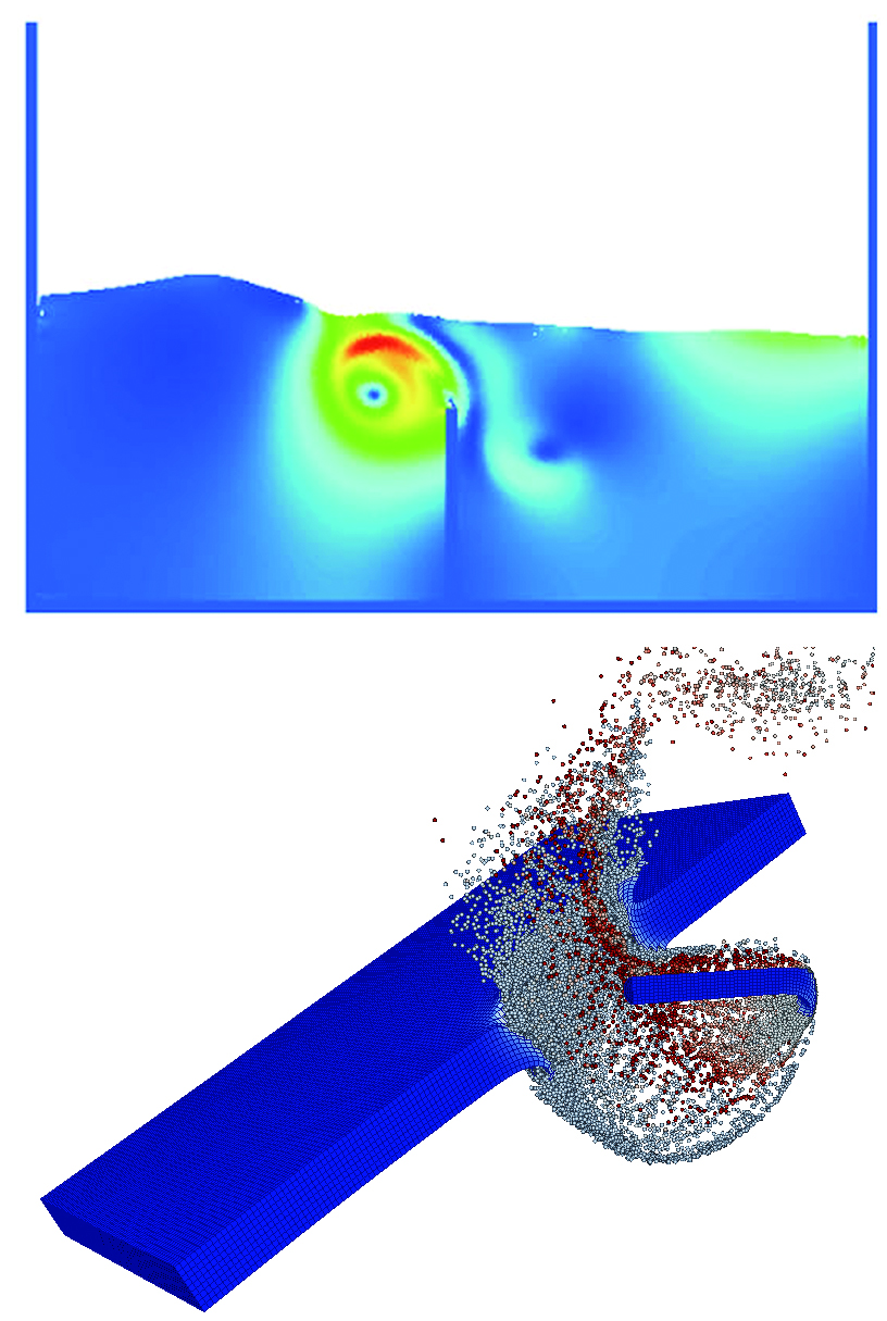 Modeling and analysis of typical problems under extreme loadings: sloshing problem simulated with incompressible material point method (upper subfigure) and penetration problem simulated with adaptive finite element material point method (lower subfigure)