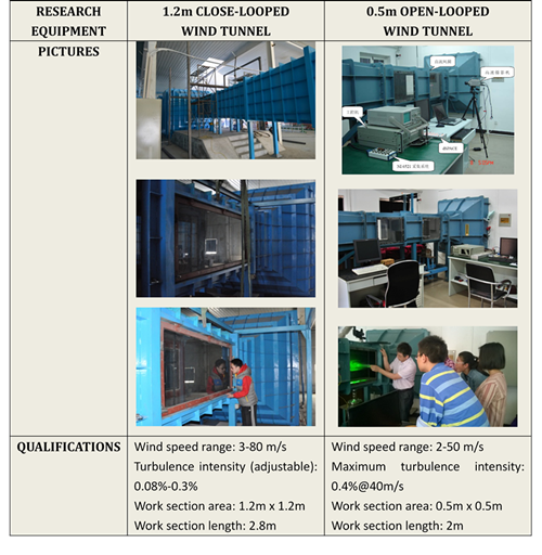 Institutes of Fluid Mechanics of Tsinghua University currently possess two wind tunnels for teaching and researching purposes. The first one is located in Tsinghua University main campus, which is an open-loop low-speed wind tunnel. The maximum wind speed is 50m/s. The cross-section area of the working section is 0.5m x 0.5m. The second wind tunnel, built in January 2015, is located in Heibei Tsinghua Developmental Institutes (Langfang city, Hebei Province). It is a close-loop low turbulence wind tunnel. The maximum wind speed can reach 80m/s, and the minimum turbulence intensity is 0.08%. The working section area is 1.2m x 1.2m.