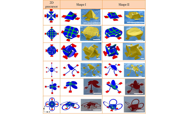 Figure 1. Process of the 3D reconfiguration for two representative morphable mesostructures. The top frame shows the reversible switch between a ‘micro-octopus’ and a ‘micro-spider’, and the bottom frame shows the reversible switch between a ‘micro-house’ and a ‘micro-basket’. The patterned 2D films are assembled into Shape I after simultaneous biaxial compression and Shape II after sequential compression along two perpendicular directions.