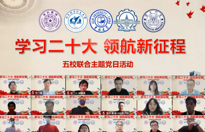 )航博181、183、192、201党支部和航硕211党支部,与哈尔滨工业大学(以下简称哈工大)防热与功能材料研究生第二党支部、轻质结构与热防护研究生第二党支部,吉林大学(以下简称吉大)机械与航空航天工程学院2022博士、2022硕士党支部,厦门大学(以下简称厦大)航空航天学院高速推进研究生党支部、飞行动力研究生党支部、航空强国研究生党支部,北京航空航天大学(以下简称北航)20个党支部的新发展党员一起,开展“学习党的二十大,领航新征程”五校联合主题党日活动。
