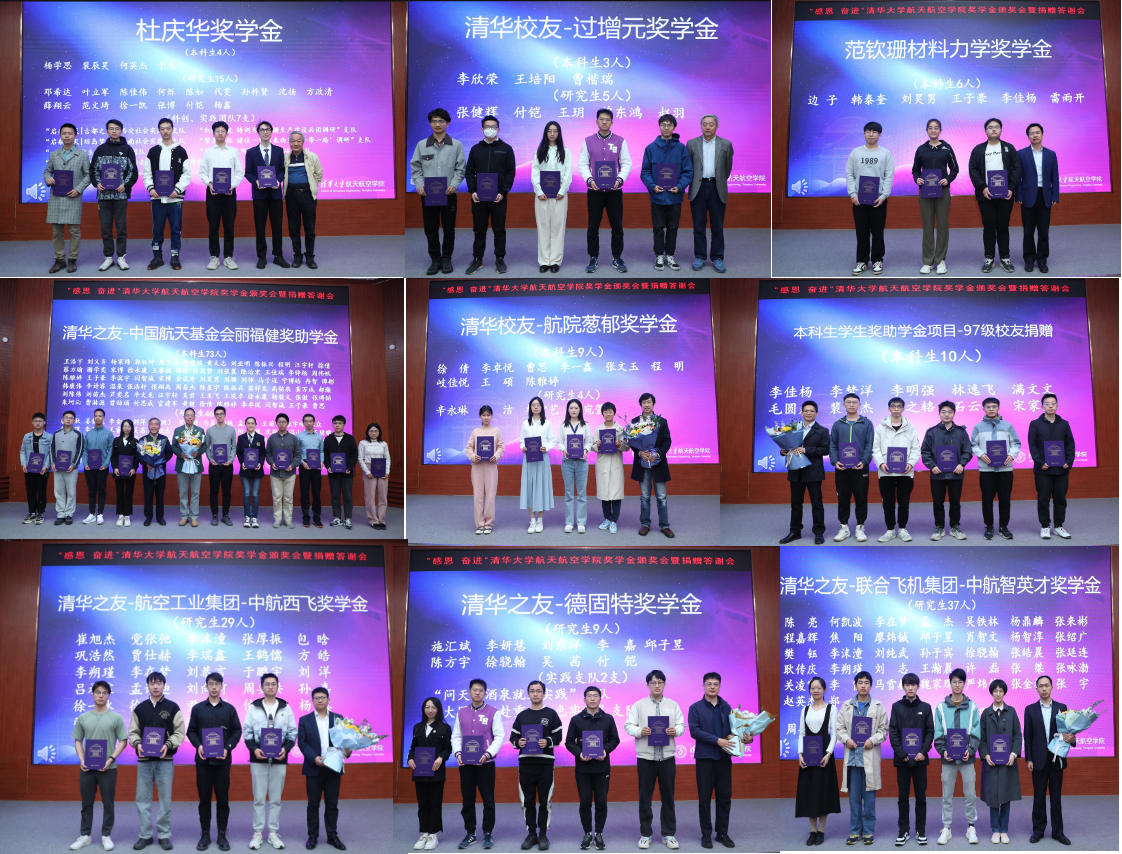 中国航天基金会高级文化顾问孙保卫和郑州丽之健体育用品有限公司总经理吕万亮为“清华之友-中国航天基金会丽福健奖助学金”获奖学生代表颁奖。中航西安飞机工业集团股份有限公司人力资源部副部长贺文勃为“清华之友-航空工业集团-中航西飞奖学金”获奖学生代表颁奖。青岛德固特节能装备股份有限公司研发部长金延超为“清华之友-德固特奖学金”获奖学生代表颁奖。北京中航智科技有限公司人力资源总监王明为“清华之友-联合飞机集团-中航智英才奖学金”获奖学生代表颁奖。