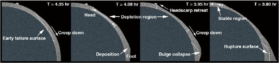 课题组使用自主知识产权的小天体颗粒动力学软件,建立了千万级颗粒精度的小天体地表模型,模拟在YORP效应作用下小天体在亿万年尺度上缓慢加速旋转的过程。结果表明,自旋加速所引起的离心力增大使得中纬度附近的颗粒层逐渐不稳定,最终滑移并沉积于赤道区域,形成鼓起的赤道脊;而在表面重塑过程中,地表巨石也随之蠕变移动,位于高纬度的巨石维持稳定,中纬度的巨石陷入下方的“流沙“中,赤道区域的巨石则被来自中纬度的沉积物完全掩埋。风化层-巨石耦合演化机制解释了陀螺型小天体的主要地质特征,显示了YORP效应在小天体地貌演变中的重要作用。