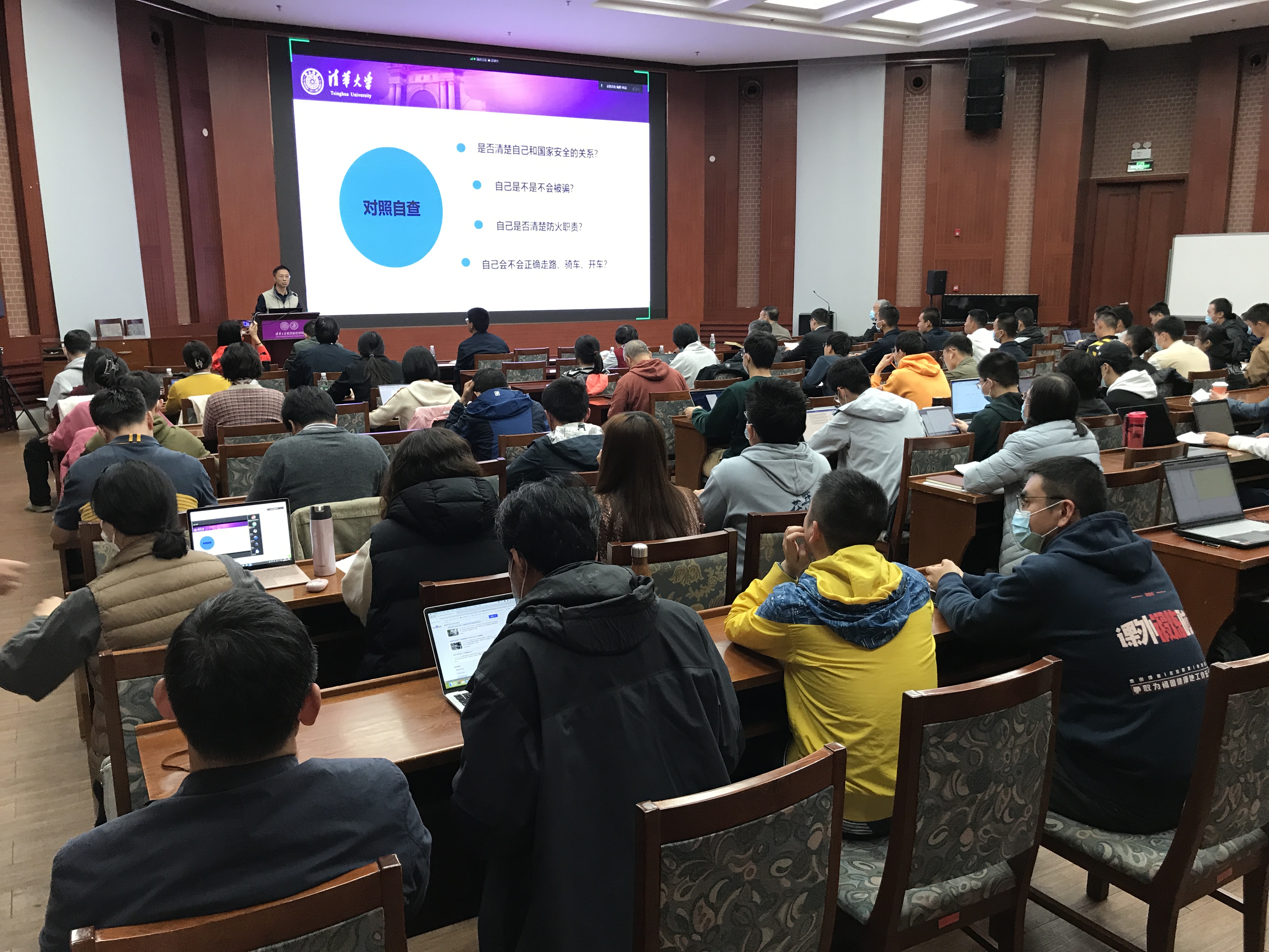 向春以“校园安全法治案例警示与重要提醒”为题,介绍了国家安全、电信诈骗、消防安全、交通安全四个部分的内容。他提到,当前维护国家科技安全、打击机密泄露的局势仍然严峻,掌握有核心技术、了解国家机密的师生尤其要提高对国家安全维护的警惕性。就身边常见的安全事故,他举出了多个电信诈骗、校园交通事故、电动车爆炸等现实中的惨痛案例,引导师生重视安全问题,并就事故防范给出相应建议。最后,向春提供了多种在遭遇安全风险时寻求帮助的渠道,为师生安全“保驾护航”。