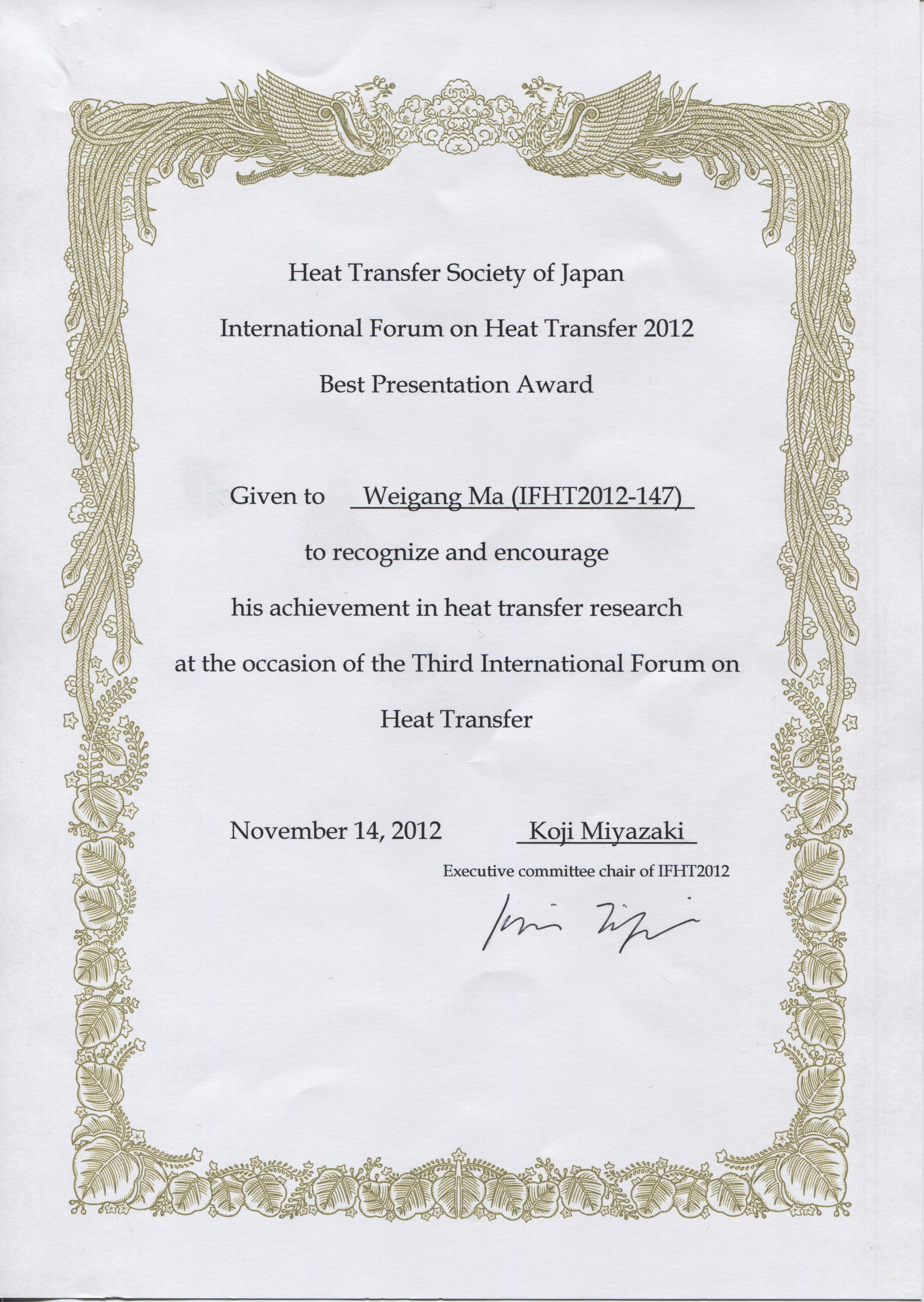 博士后马维刚获第三届国际传热论坛“Best Presentation Award”