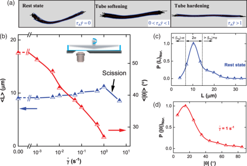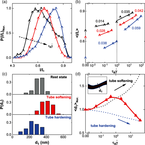 曹炳阳教授和美国科学院院士、韩国基础科学院软物质及生命材料基础科学研究所史蒂夫·格拉尼克(Steve Granick)教授课题组合作在期刊《物理评论快报》(Physical Review Letters)上发表了题为“生物聚合物链缠结在剪切流场中先软化后硬化”(Biopolymer filament entanglement softens then hardens with shear)的论文。通过单分子荧光成像技术,直接观测到了单分子肌动蛋白在剪切流场中的定向排列与拉伸行为。随剪切速率的增加,聚合物分子链的管道先在定向排列的作用下“软化”,再在拉伸的作用下“硬化”。这表明聚合物的动态局域行为受到单分子链的定向排列与拉伸的共同影响。