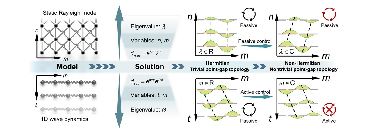 自然界和人工系统的演化往往是非保守的,伴随着与外部环境间的能量交换。例如,运动的物体会因为空气阻力而损失动能,冰在融化时会不断吸收外部热量等。这些非保守的动力学演化过程可以用一类特殊的算符—非厄米哈密顿量进行刻画。当系统的微组织结构是规则周期时,它的宏观属性在很大程度上取决于周期结构的能带特性。如果将非厄米与拓扑能带巧妙结合,则有可能在拓扑绝缘体、拓扑声学和拓扑力学等系统中催生出奇异点、宇称-时间对称性及非厄米趋肤效应等一系列新奇的拓扑现象,在能量收集、信息传输、认知型材料等方面具有广泛的应用前景。