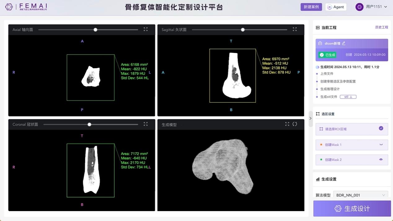 庄茁教授团队以“FEM+AI”先进计算软件为核心开发的智能化骨修复体定制设计平台,可用于智慧医疗的个性化骨修复体快速设计制造,为传统定制化骨植入器械治疗手段中设计耗时长、成本昂贵、性能不匹配等夹脖子难题提供了全新解决方案。