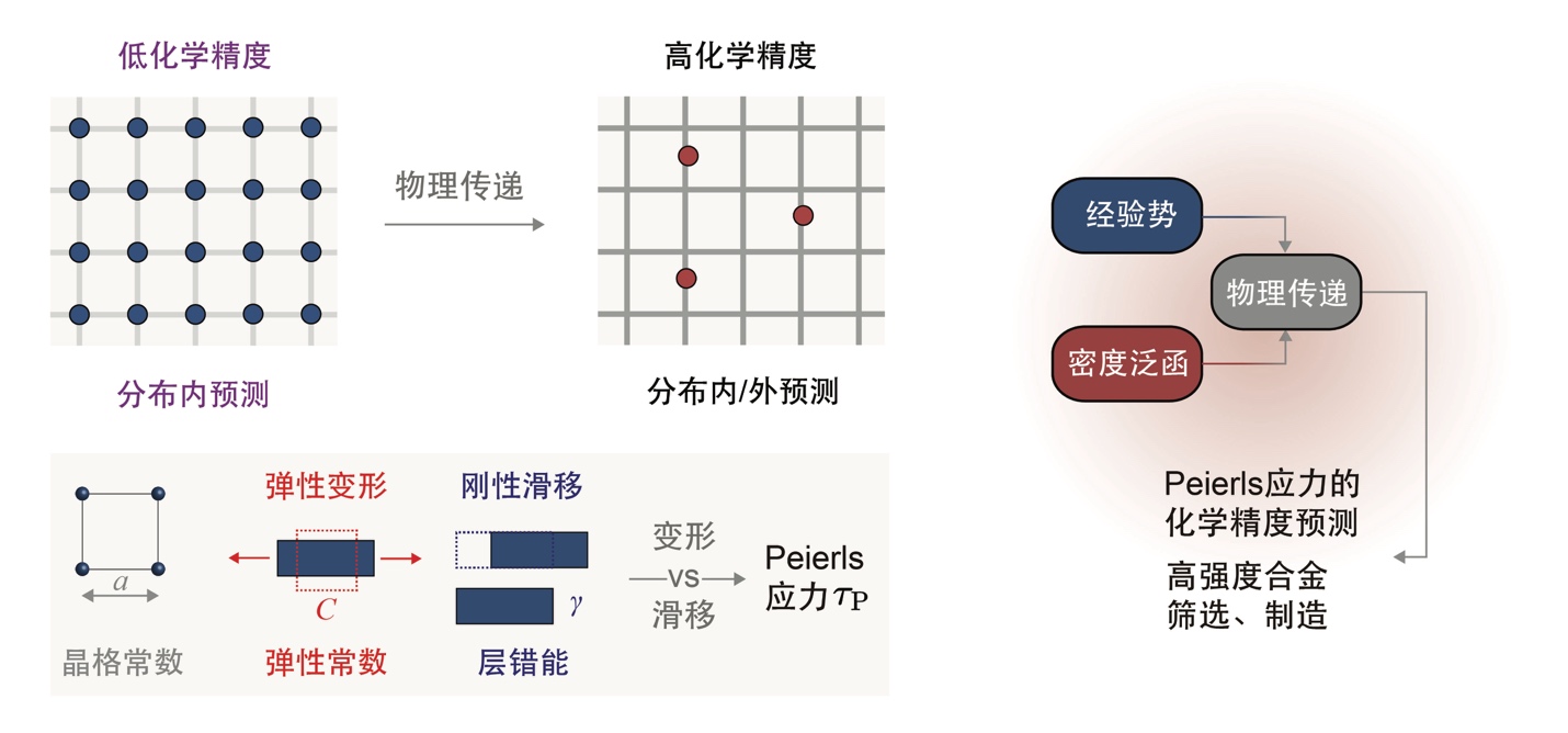 传统上,科学进展遵循“观察-假设-建模”的范式,而基于科学数据的人工智能技术为工程科学提供了一种变革性的替代路径。为应对上述挑战,徐志平课题组提出了物理传递学习框架。通过有效传递原子尺度结构、相互作用及其与材料力学性能关联数据中所蕴含的物理规律,该框架在模型与数据之间架起桥梁,实现了以化学精度进行材料强度快速筛选(图2)。具体而言,研究首先利用复杂性较低但包含正确物理机制的低保真度经验力场模型数据训练神经网络,成功捕捉晶体塑性变形的本质特征表征。随后利用基于密度泛函理论的第一性原理高保真度计算关键描述参数,并将其嵌入训练得到具有物理约束的神经网络模型进行外推,既保证了模型的化学精度,又避免了直接采用第一性原理模拟位错行为带来的巨大计算成本。该框架有效解决了跨尺度力学模拟中精度与效率难以兼顾的关键难题。在该方法中,模型的泛化性由不同化学精度数据集中变形物理的一致性加以保障。