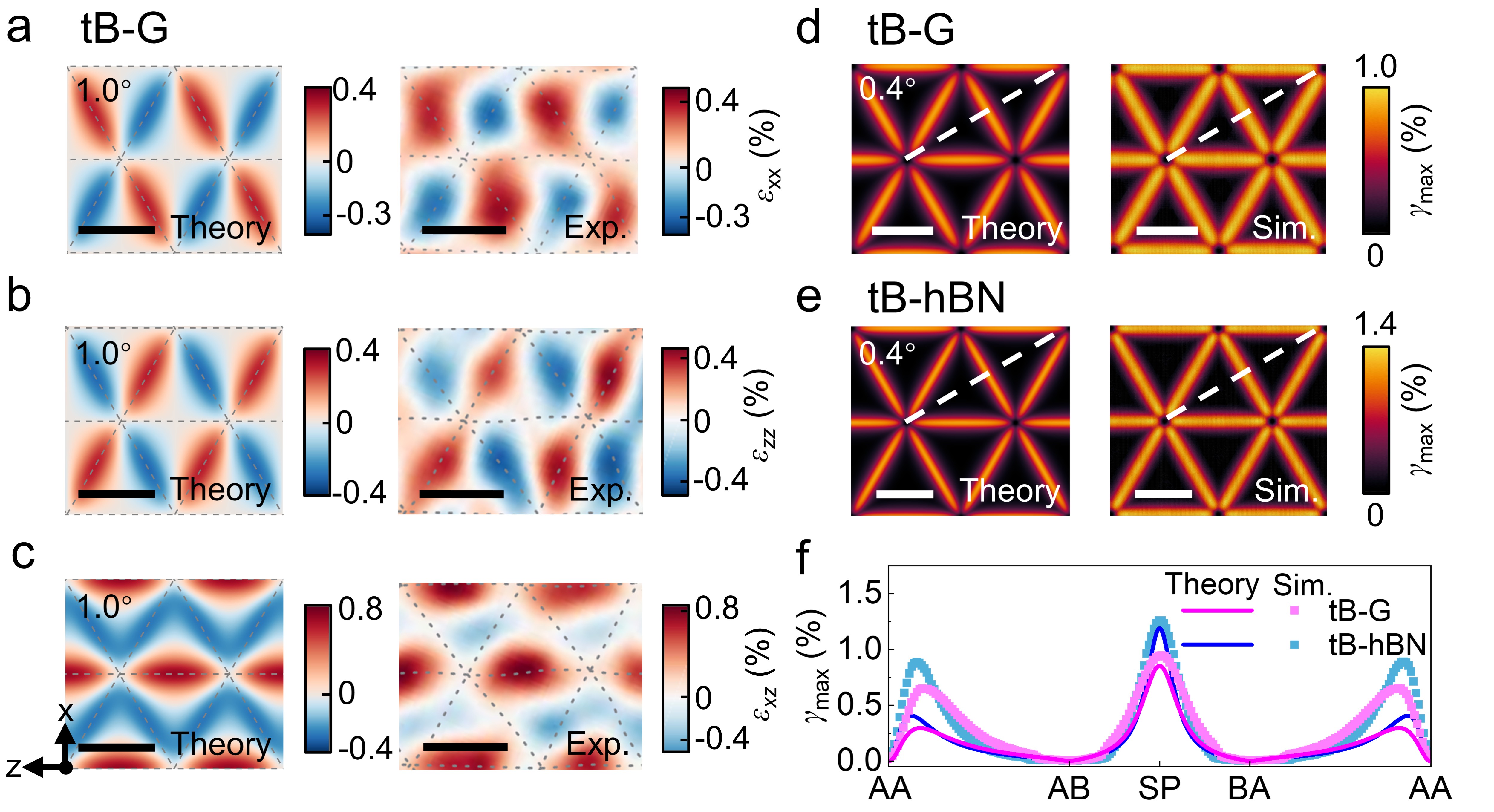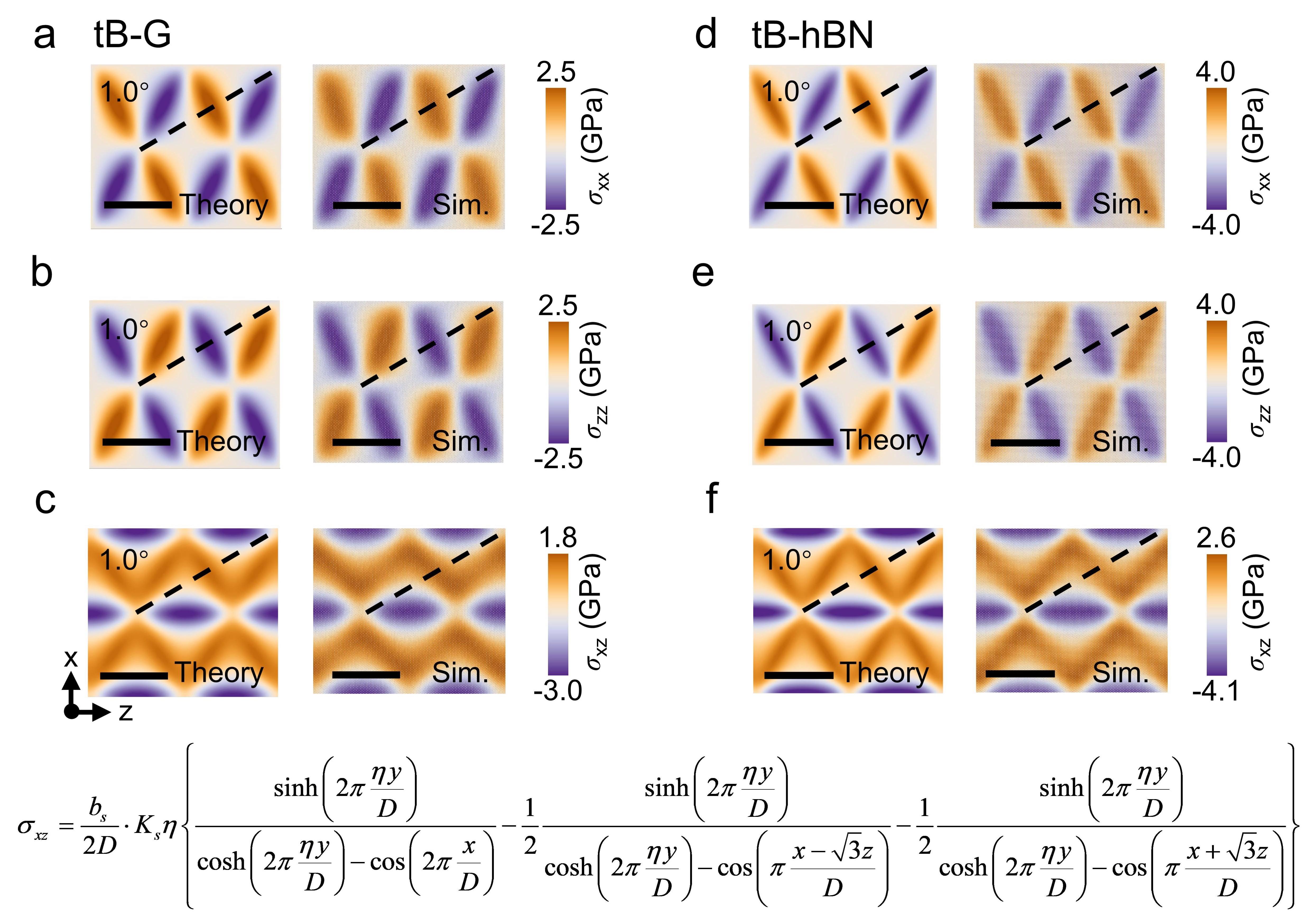 以及力学与工程交叉研究院李晓雁教授课题组基于各向异性位错理论,建立了一套全解析的理论模型,清晰地揭示了“扭转角度—结构变形—能量特征”三者间的精确定量关系。在小扭转角度下,扭转二维材料的莫尔云纹主要表现为由分位错构成的三角形网络结构。该模型给出了扭转二维材料的局域旋转场、应变场及应力场的完整解析表达式(图2-4),并阐明了能量密度随扭转角度变化的非线性规律(图5)。当扭转角度较大时,莫尔云纹则呈现以AA堆垛为核心的六边形畴结构及伴随的畴壁网络。针对这一结构特征,该模型同样建立了能量密度与扭转角度之间的解析关系。在0°到30°的扭转角度范围内,随着角度增大,扭转二维材料的能量密度呈现先快速升高、后逐渐趋于饱和的变化趋势(图5)。为进一步验证和完善理论模型,针对扭转双层石墨烯(tB-G)、扭转六方氮化硼(tB-hBN)及扭转三层石墨烯(tT-G)体系开展了大规模原子模拟,并将理论预测与模拟结果和已有研究进行了对比。模型所预测的局域旋转场、应变场、应力场以及能量密度随扭转角的变化规律,均与原子模拟结果以及已有实验和模拟数据高度吻合(如图2、图3、图5),表明该理论模型能够准确描述扭转二维材料的结构变形与能量演化特征。该研究不仅深化了对二维材料莫尔超晶格物理机制的认知,也为系统表征该类材料的变形与能量特征提供了一套完整的解析理论框架,为主动设计和精准调控扭转二维材料的物理特性提供了重要的理论基石。