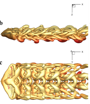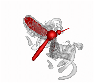 典型飞行和游动生物的几何模型采用非结构网格或Level Set方法;运动模型采用实验观察数据;通过三维瞬时涡结构及升阻力变化分析升力或推力的产生机制。
