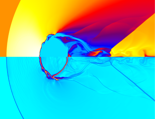 基于BGK-Boltzmann方程,发展了适合多尺度流动的新型高精度格式:分块结构/非结构网格、单步时-空2阶/两步4阶精度、显式/隐式格式;适用于从近不可压到高超声速流动,兼具高精度与强稳健性。发展了能高效模拟从连续到稀薄的跨流域流动的统一气体动理学方法:在网格规模550亿,使用2500-20000核时仍可达到线性加速比。发展了适合高马赫数、大密度比多介质流动的动理学格式。