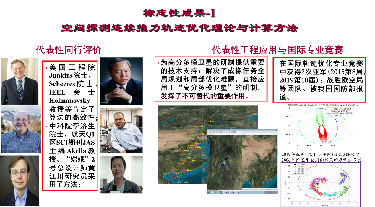 3. 建立的理论和方法应用于载人航天、遥感卫星等重大工程,解决了航天动力学与控制相关的难题;应用于国际空间探测轨迹优化专业竞赛,获得2亚军1季军,战胜了欧空局、德国宇航中心、佐治亚理工等著名航天机构和高校。获上海市技术发明一等奖(2018年)和军队科技进步一等奖(2017年)。