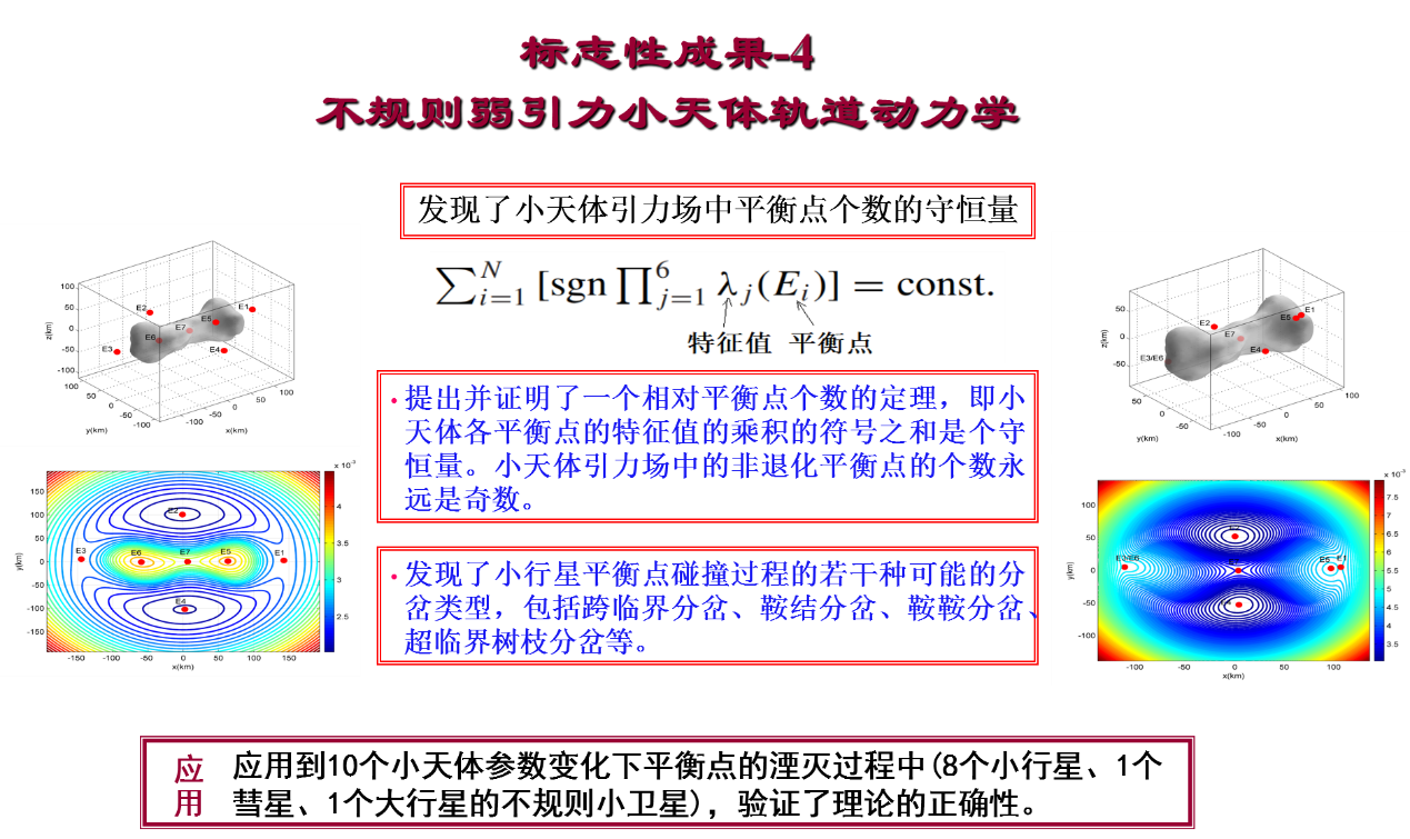 2. 深化和拓宽了航天动力学与控制研究领域。将相对/绝对轨道运动理论完善于近地空间环境、拓展于深空非中心引力场,发展了复杂多变深空环境下多项轨道优化设计概念与方法,揭示了碎石堆小行星结构演化的新机理。发表SCI论文100余篇,出版专著4部,培养校级以上优秀研究生学位论文获得者十余人。获得宝钢优秀教师特等奖和国家级教学名师称号。