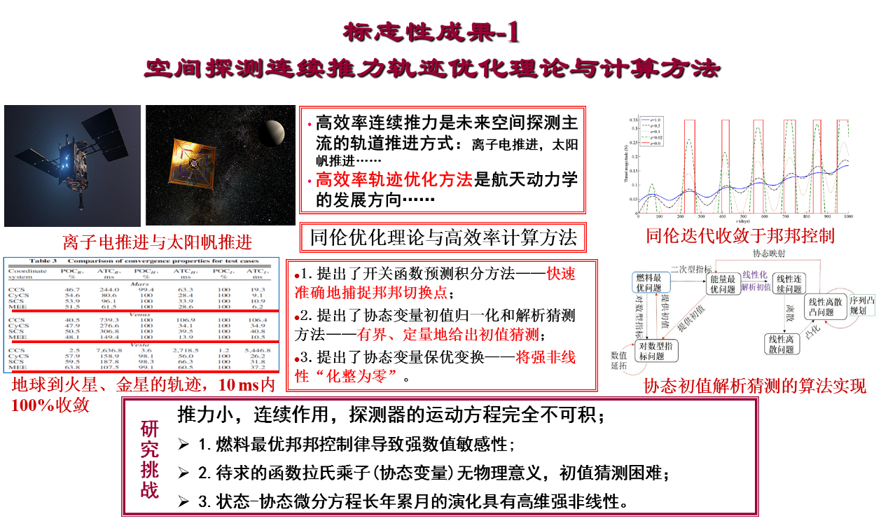 2. 建立了连续推力轨迹同伦优化理论与高效率计算方法,解决了数值敏感、初值猜测等难题,发表的顶刊论文被广泛引用并连续5年入选ESI高被引论文,被中美俄多位院士好评、采用。空间探测连续推力轨迹优化研究获得国家自然科学优秀青年基金资助。
