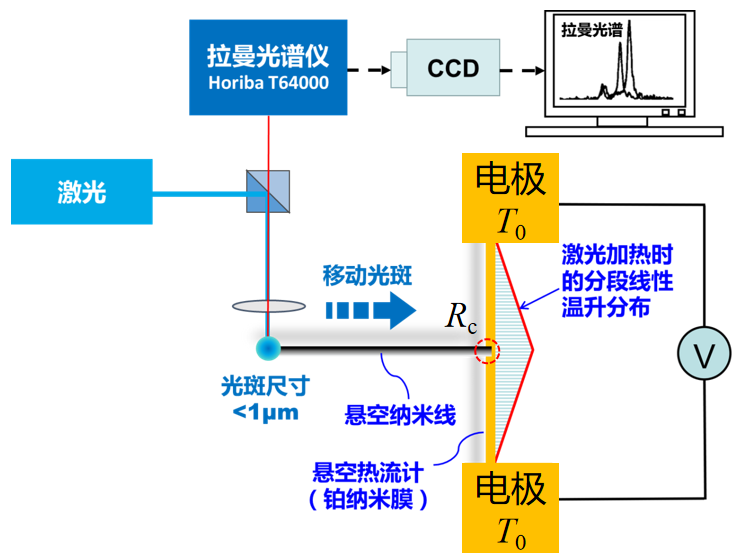 悬空纳米线搭接在悬架铂纳米膜中心,利用激光加热纳米线,同时激发拉曼光谱;