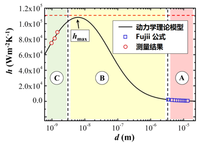 理论模型预测结果同实验结果符合良好,并且预测存在一个传热系数的极大值。